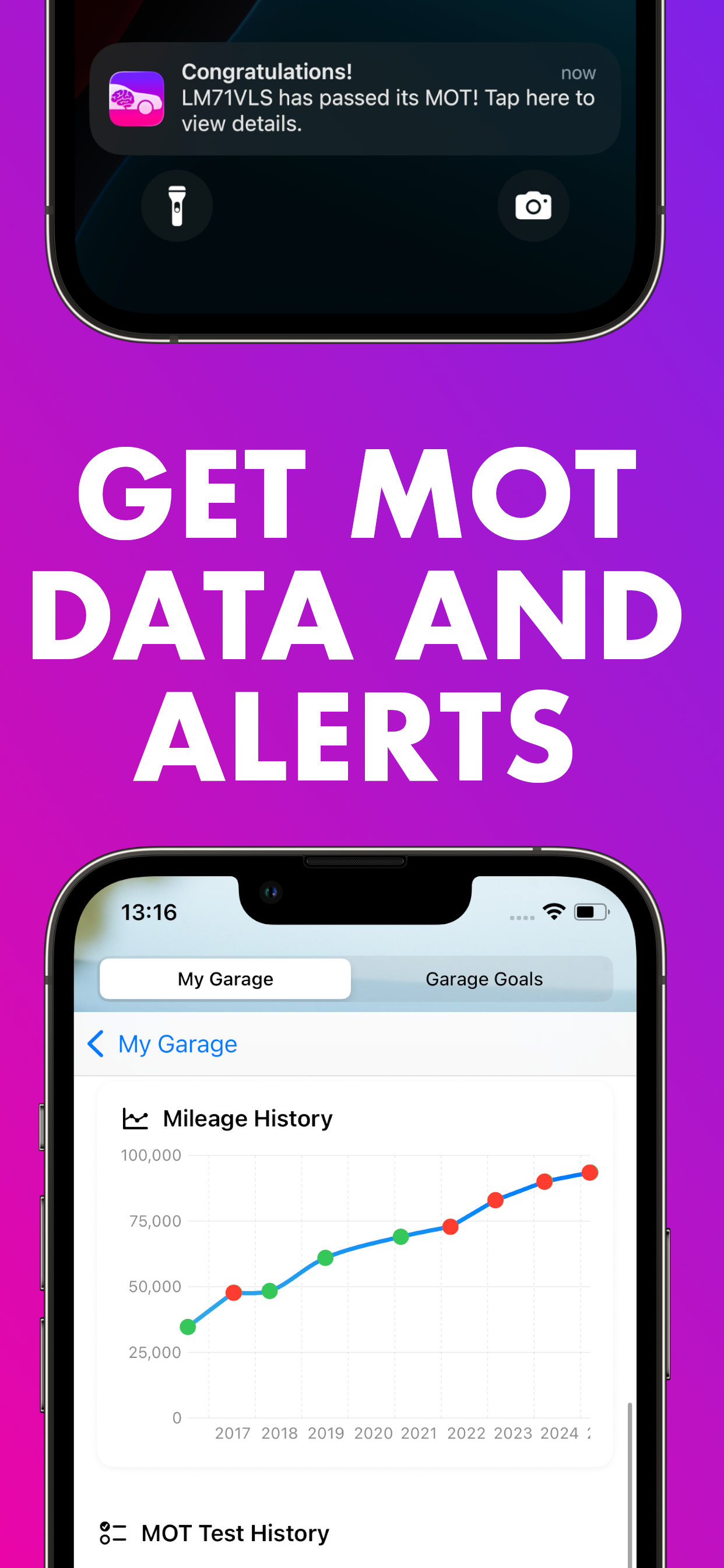 Instant lookups – Enter a reg number to see make, model, MOT history, and more.
